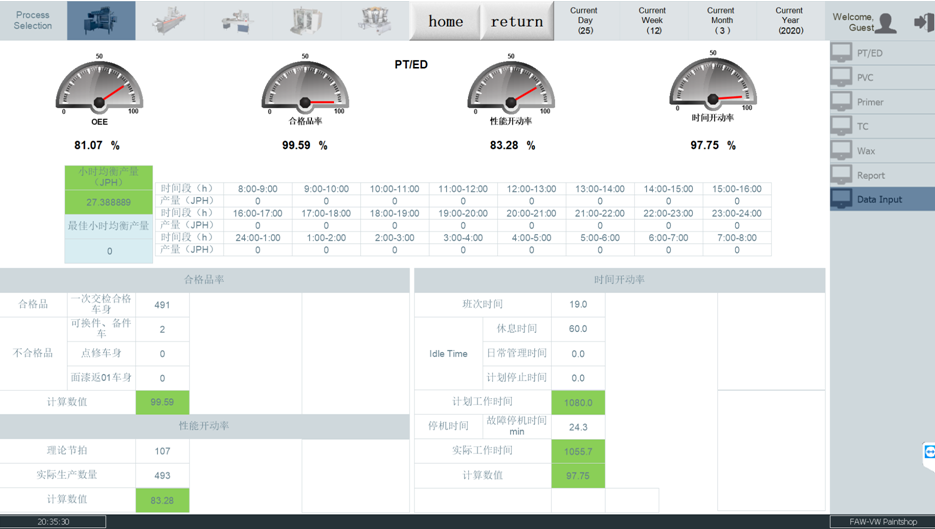 涌明OEE系統(tǒng)由3個因素組成 時間開動率:實際工作時間與計劃工作時間的比值。 性能開動率:理論節(jié)拍*實際生產(chǎn)數(shù)量/(實際工作時間*3600)。 合格品率:合格品/(合格品+不合格品)。 工作流程 配置配方元素:配置各個工藝的配置參數(shù)。 實時采集生產(chǎn)數(shù)據(jù):采集計算需要的每個工藝的生產(chǎn)數(shù)據(jù)數(shù)據(jù)。 查詢數(shù)據(jù):根據(jù)日期查詢指定時間內(nèi)的數(shù)據(jù)。 生成報表: 生成指定時間內(nèi)的報表。 |
